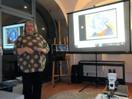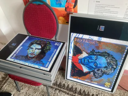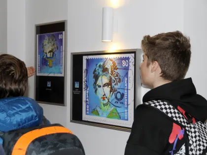 Die Ausstellung zeigt die Beethoven-Briefmarke, die von Marion Bernhardt in Mikromalerei unterschiedlich bemalt wurde. Dadurch ist eine Verbindung von Bildender Kunst und Musik sowie zu Leiipzig entstanden. Beethovens Leben und Werk wird in dieser Ausstellung für Musikschüler ansprechend und verständlich gestaltet.