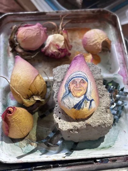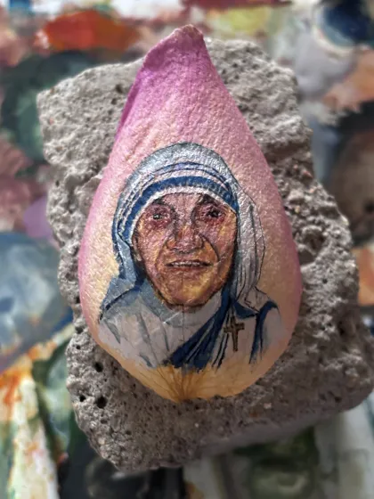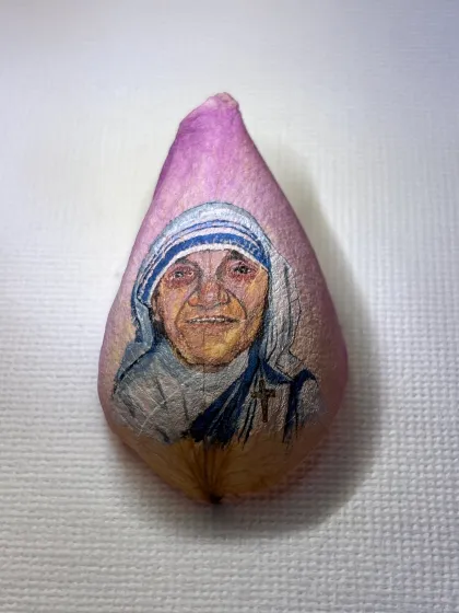 Besondere Heilige auf Rosenblatt gemalt: neben einem heiteren Papst Franzsikus habe ich auch Mutter Teresa ins Bild gesetzt.